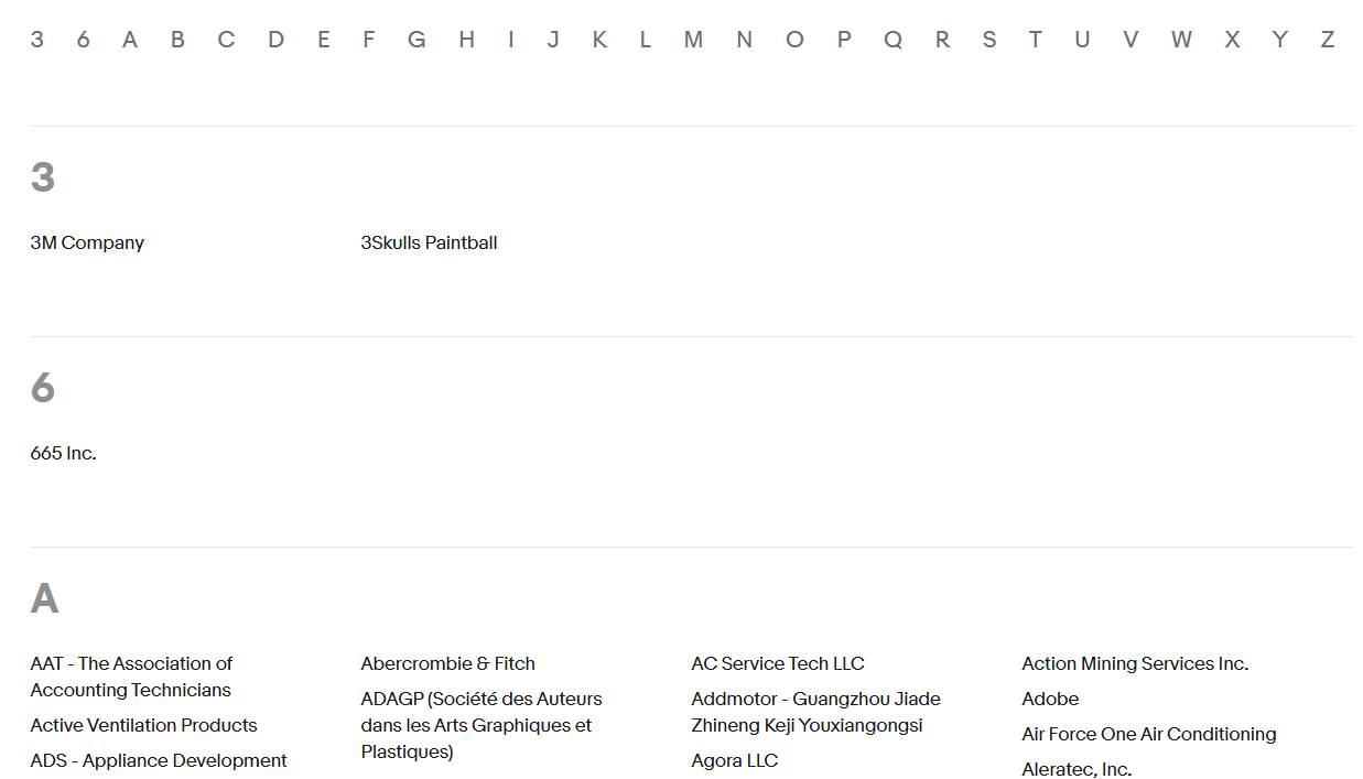 アルファベットや数字を選択すると、企業名が表示されるのでクリックして、VeROの詳細を確認してください。